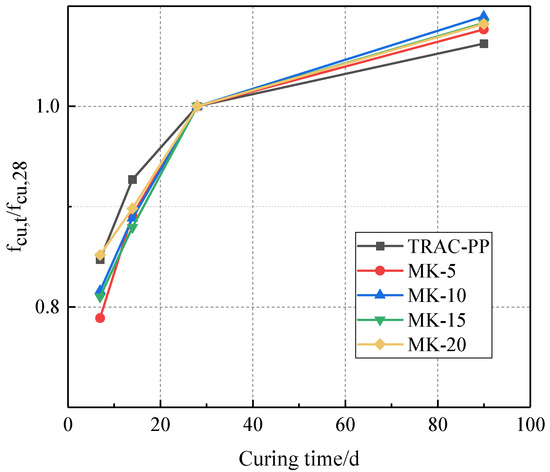 Figure 6 displays the effect of curing time on the compressive strength of concrete cubes. MK concrete exhibited a rapid early strength development, with the 7-day cubic compressive strength reaching over 78% of the 28-day strength. Beyond 28 days, the rate of strength development decelerated. Notably, as the MK content increased, the strength growth rate of the concrete between day 7 and day 14 diminished. This reduction was attributed to the interaction between MK and the previously formed C-S-H gel during cement hydration, resulting in the formation of additional hydration products. These hydration products enveloped the unhydrated cement particles, thereby impeding further hydration.
