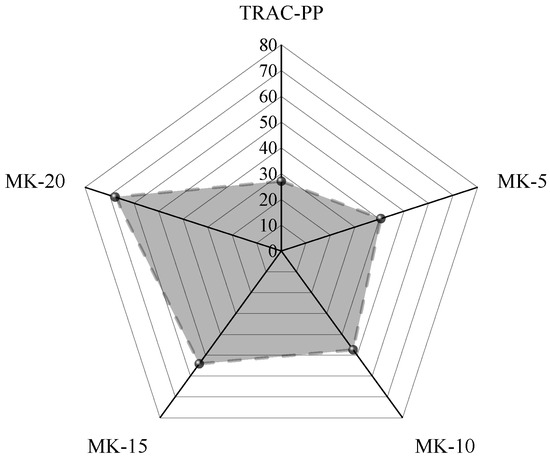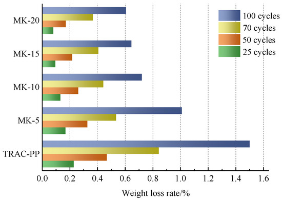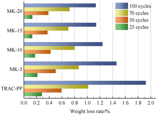 Notably, the rate of weight loss increased more rapidly in the absence of MK, as illustrated in Figure 11. Incorporation of MK resulted in a significantly lower weight loss rate. For instance, upon reaching 100 cycles, TRAC-PP’s weight loss rate was 1.92%, in contrast to MK-5, MK-10, MK-15, and MK-20, which had rates of 1.46%, 1.24%, 1.14%, and 1.13%, respectively. These findings indicated that increasing MK content led to a reduction in the weight loss rate. Specifically, the reduction ratio of the MK-20 specimen reached as high as 41.4%. The addition of MK to TRAC-PP enhanced its resistance to freeze–thaw cycle erosion in the sodium sulfate solution.