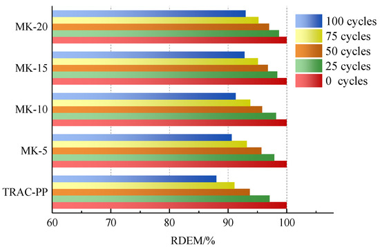 The RDEM serves as a metric for assessing the uniformity and quality of materials. Figure 10 illustrates the variations in RDEM for each concrete sample exposed to freeze–thaw cycles. In general, the RDEM of the samples diminished with an increase in the number of cycles. TRAC-PP underwent freeze–thaw cycles, leading to a reduction in RDEM ranging from 2.9% to 12%. For MK concrete, the reduction rate of RDEM ranged from 1.3% to 9.4%. Therefore, concrete with varying MK content exhibited an enhanced resistance to freeze–thaw cycles than the control concrete TRAC-PP.