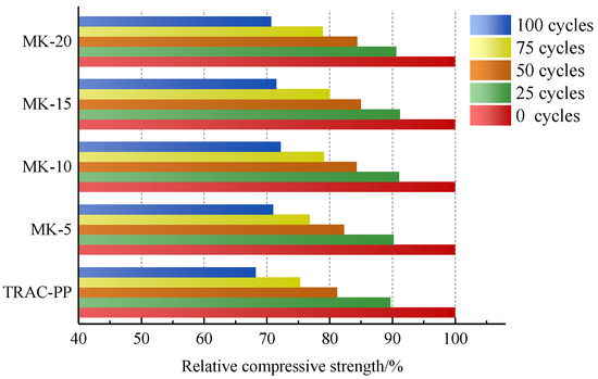 Figure 9 illustrates the change in relative compressive strength of concrete following freeze–thaw cycles. After undergoing 25, 50, 75, and 100 cycles, TRAC-PP’s relative compressive strength was recorded at 93.1%, 89.2%, 84%, and 77.1%, respectively. After 25 cycles, the relative compressive strengths of MK-5, MK-10, MK-15, and MK-20 were 95%, 97.6%, 98.2%, and 98%, respectively. After 100 cycles, these values decreased to 83%, 86.3%, 88.5%, and 90.1%, respectively. As the substitution rate of MK increased, the loss in relative compressive strength decreased, with 20% MK replacement demonstrating the best results. The notable enhancement in freeze–thaw resistance may be ascribed to the supplementary C-S-H generated by the pozzolanic reaction of MK. Additionally, the ultrafine particles of MK increased the density of the concrete matrix, thereby augmenting its strength under freeze–thaw cycles.