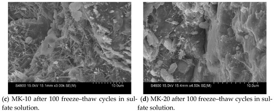 - Damage from freeze–thaw cycles was worsened by exposure to sulfate solutions. The addition of MK to concrete significantly enhanced its resistance to freeze–thaw cycles and mitigated the erosive effects when exposed to both sulfate and freeze–thaw cycles.
