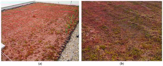 Change in the vegetation cover on the roof during different years: (a) vegetation in 2023; (b) vegetation in 2024. The planted species consist mainly of drought-tolerant Sedum cuttings and perennials.