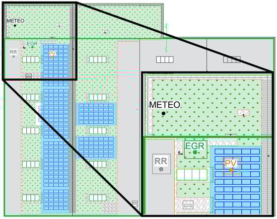 Identification of observed locations in the floor plan, with designation of roof variants: RR—reference roof, EGR—extensive green roof, PV—roof under photovoltaic panels.