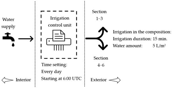 The drip irrigation system was controlled by a central unit programmed for timed irrigation. Watering was initiated every morning at 06:00 UTC (Coordinated Universal Time), supplied by the internal water network. The distribution system was organized into six independent irrigation circuits in the areas with hydroaccumulative boards, which were irrigated sequentially. Each circuit received 15 min of irrigation at a rate of 5 L/m2 per cycle. Figure 6 presents a schematic diagram of the irrigation system.