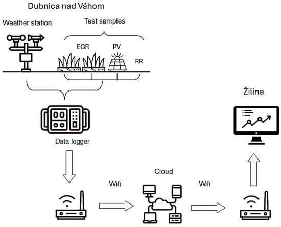 Data from the sensors and the meteorological station were connected to a data logger located inside the building. The data acquisition interval was set to one minute. The data logger was continuously connected to a Wi-Fi network, and data were stored in the cloud. Data were accessed directly from the cloud at the Žilina University workplace. A block diagram of the data acquisition system is presented in Figure 8. The collected data was subsequently processed into a statistical dataset. For comparative analysis, data from the relevant sensors were selected for the specified period.