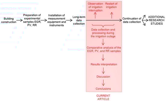The data collected during both the irrigation outage and the recovery period were subsequently processed and analyzed. A comparative assessment of the EGR, PV, and RR samples was conducted, focusing on surface and substrate temperatures, moisture content, and heat flux. The results were then interpreted, followed by a discussion of their implications and conclusions regarding the thermal performance and cooling potential of the different roof assemblies.