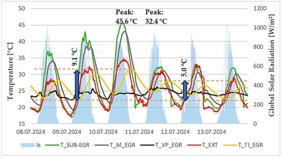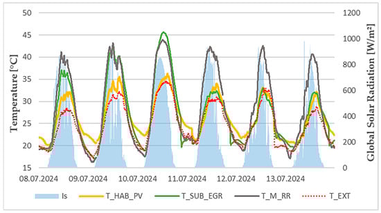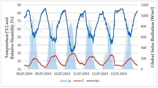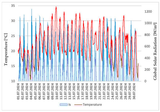 The experimental site in Dubnica nad Váhom, Slovakia, is characterized by a temperate continental climate with warm summers and cold winters. The Slovak Hydrometeorological Institute classifies the region as a moderately warm continental zone. During the summer of 2024, when the measurements were conducted, average daytime air temperatures ranged between 25–32 °C, with peak solar radiation exceeding 900 W/m2 on clear days. Relative humidity varied between 40–65%, and total precipitation during the monitoring period was limited, leading to predominantly dry conditions. The graph in Figure 10 presents the course of temperature and solar radiation during the summer month of July 2024.