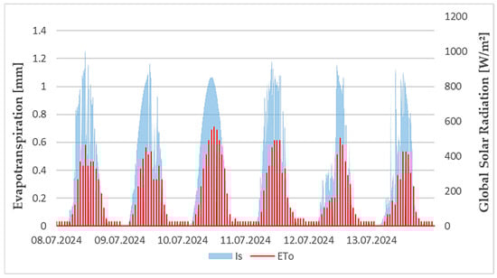During the monitored period, the highest daily sum of solar radiation intensity (IS) was recorded on 10 July (non-irrigated day), reaching a value of 435,022 W/m2, which corresponds to approximately 26.10 MJ/m2 per day. The net solar radiation incident on the structure when determining the theoretical ET after taking albedo into account was 20.1 MJ/m2. On this day, the highest value of theoretical evapotranspiration (ET) was also determined at 6.26 mm/m2·day (Figure 12). However, since drip irrigation was not activated on that day, it was not possible to achieve full ET. The incident solar energy was therefore not significantly used for the process of water evaporation but appeared as an increased density of heat flow penetrating into the interior.