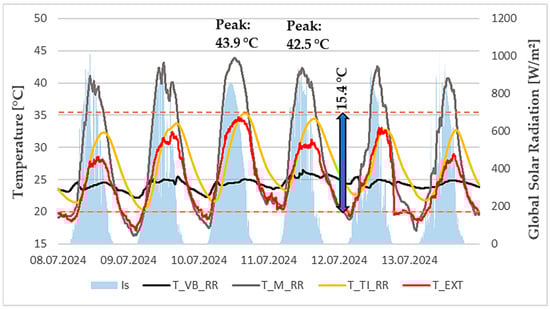 A comparison of the temperature profiles in the EGR and RR samples reveals the hydroaccumulation and evapotranspiration effects of the green roof, which contributes to limiting overheating and mitigating daily temperature fluctuations. In the case of the RR sample (Figure 15), there is a clear regular daily temperature fluctuation with a high range, with the temperature amplitude at the level of thermal insulation reaching values exceeding 15 °C. The temperature fluctuation at the waterproofing level is more than 26 °C in the case of RR, which is more than double the value in the case of restarting irrigation of the EGR sample. These differences highlight the ability of green roofs to stabilize the temperature regime of the roof structure through a combination of moisture accumulation and cooling via evapotranspiration.