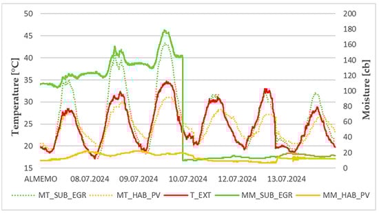 From this moment on, the EGR sample maintained a stable higher moisture content and lower temperature compared to the period before irrigation. On the contrary, the sample using PV panels maintains increased moisture in the substrate even when not irrigated due to the shading of the PV panels (presented by orange solid line). These areas are not exposed to direct sunlight, and without the vegetation, suitable moisture levels can be maintained in the hydroaccumulation boards—only evaporation occurs and due the PV shade is limited. After irrigation started, a drop in temperature was also observed in this sample (presented by orange dashed line), with values remaining consistently lower than the ambient air temperature.