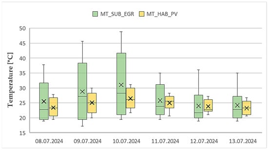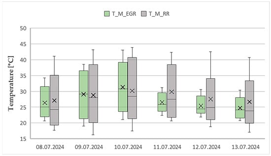 Active irrigation can effectively regulate the temperature profile in green roofs. It creates passive protection against temperature fluctuations, especially in the waterproofing zone, which is most exposed to outdoor weather conditions. Constant expansion and contraction throughout the year can lead to degradation of the integrity of the waterproofing membrane, creating potential damage points that can degrade the primary function of the flat roof waterproofing system. The following box plot graphs in Figure 17 provide a more detailed analysis and comparison of the temperature curve at the waterproofing level between the RR and EGR samples. A shallow layer of vegetation substrates in a dry state has minimal protective potential in terms of reducing temperature fluctuations at the waterproof membrane. Gradual drying of the substrate reduces the possibility of evaporative cooling, which could maintain a favorable temperature. After restarting irrigation, when the substrate contains enough water to support effective evapotranspiration, we can notice a reduction in temperature fluctuations. Although the average temperature on 8 July 2024, and 11 July 2024, does not differ much, the temperature fluctuation has been reduced by more than half. Over time, this reduction in temperature fluctuation can prove to be a suitable passive protective effect not only for cooling but also in terms of extending the service life of the waterproofing material.