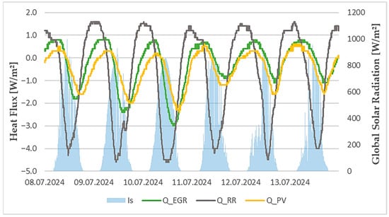 The impact of starting up the irrigation system is particularly noticeable in the temperature and heat flow in the individual roof structures. The graph in Figure 13 illustrates the temperature curve on the surface (substrate in the case of EGR and PV and at the waterproofing membrane in the case of RR). The graph indicates that the EGR composition can achieve higher surface temperatures than the RR sample (10 July 2024). This is mainly due to the fact that the EGR surface is not yet completely covered with vegetation. The significantly darker surface of the expanded clay substrate, which has a lower albedo than the surface of the light-colored waterproofing membrane in the case of the RR sample, absorbs more solar radiation. Since there is no water supply, the heat gained helps to increase the temperature in the structure. After turning on the irrigation system, a dramatic difference in temperature can be seen in the EGR sample. The maximum temperature at the substrate level reaches 32.4 °C, while the day before, during the non-irrigation period, it reaches 45.6 °C. While the RR sample continues to trend toward increased surface temperature, the EGR sample maintains a consistently lower temperature after irrigation is started. The surface temperature is maintained close to the outside air temperature due to evaporation. The sample using PV panels (PV) does not experience such a noticeable change. This is mainly due to the permanent shading of the PV panels. The shade created near the PV panels reduces the temperature and also keeps the area under the panels more humid. The sample maintains a consistently lower temperature from the previous irrigation period.