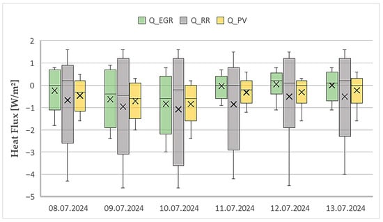 The box plot highlights that, during the irrigated period, the EGR sample exhibited reduced heat gains compared to the PV and RR samples. Specifically, afternoon heat flux into the interior with the EGR decreased by 40–55% relative to the non-irrigated period, while the PV sample showed only a minor reduction (10–15%) due to partial shading by the panels, and the RR sample remained nearly unchanged (see Figure 19). These results suggest that irrigated EGRs can enhance evaporative cooling under high solar radiation conditions, even though PV panels maintain lower hydroaccumulation board temperatures. This demonstrates that, although PV panels provide effective shading and can keep the sample cooler than the EGR vegetation cover (Figure 18), PV does not provide as effective evaporative cooling as EGRs—the EGR sample indicates substantially lower heat gains into the hall interior compared to the PV sample (Figure 20). A vegetation sample exposed to direct sunlight can consume and utilize a significant portion of solar energy for natural evaporation.