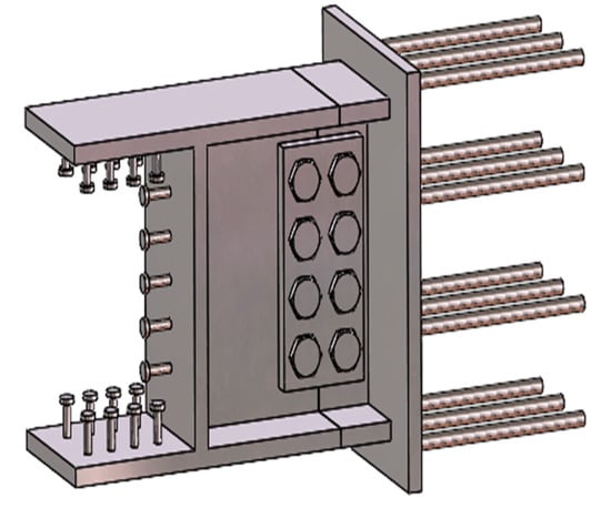 The proposed beam–column joint can be designed for conventional prefabricated concrete frames according to China’s current Code for Design of Concrete Structures (GB50010) [] and Code for Seismic Design of Buildings (GB50011) [], with equivalent strength replacement of joint components following the Standard for Design of Steel Structures (GB50017) [].