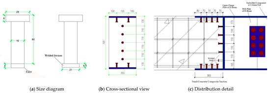 Two 1:2 scale specimens were designed: a conventional cast-in-place beam–column joint and a novel prefabricated concrete joint with identical dimensions. To establish an equitable benchmark, the JD-# joint strictly follows conventional frame connection practice: beam longitudinal bars 6Φ16 (HRB400) run continuously through the joint core, and column longitudinal bars 8Φ18 (HRB400) are continuous top-to-bottom. The joint core is reinforced with Φ8@100 four-legged stirrups, giving a volumetric ratio of 1.2%; bar clear spacing is less than 25 mm. In the 1:2 scale model, the total steel area in the core reaches 1810 mm2, resulting in clear congestion. By contrast, the PC-# joint relocates the plastic hinge into the steel beam via embedded steel connectors; the core requires only Φ8@150 two-legged stirrups, reducing the steel area to 1090 mm2—approximately 40% less—thereby directly demonstrating the stated advantage of alleviating reinforcement congestion. All other geometric dimensions and concrete cover thicknesses are identical between the two specimens. The new joint’s dimensional details and reinforcement layout (Figure 2) feature [longitudinal rebars] and [stirrups] with C35 concrete. Figure 3 shows the stud connectors’ dimensional drawings, cross-sections, and distribution details. The specimens are designated as “JD-#” for cast-in-place joints and “PC-#” for prefabricated concrete joints.