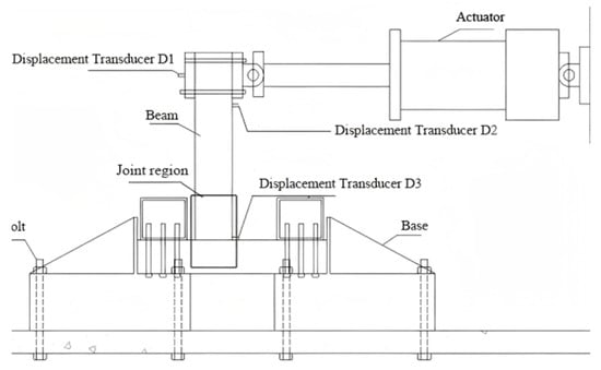 Pseudo-static tests were conducted using an end-loading scheme on the beam, following the loading protocol specified in GB/T 50152-2012 and ISO 22762-2:2021 []. Due to limitations of the testing site and equipment, an inverted “T”-shaped fixation scheme was adopted, as shown in Figure 4. We can meet the experimental requirements by adopting an inverted T-shape; the column was positioned parallel to the horizontal ground, while the beam was oriented perpendicular to the horizontal ground. The actuator applied horizontal push and pull loads at the end of the beam. Based on factors such as the test model, laboratory equipment, and testing site, a complete loading apparatus was designed, including a domestic servo actuator, a reaction steel base (which can be bolted to the ground), a steel compression beam (which can be connected to the base with bolts), and three displacement transducers. The three displacement transducers were used to monitor the horizontal displacement of the actuator and the actual horizontal displacement of the specimen at the loading centerline, specifically at nodes D1 and D3 in Figure 4, to calculate the rotation angle of the specimen. D2 represents the displacement 20 mm below the loading centerline. When the data from the D1 displacement transducer is erroneous or has a large error, D2 is used to back-calculate the actual displacement at the loading centerline of the specimen.