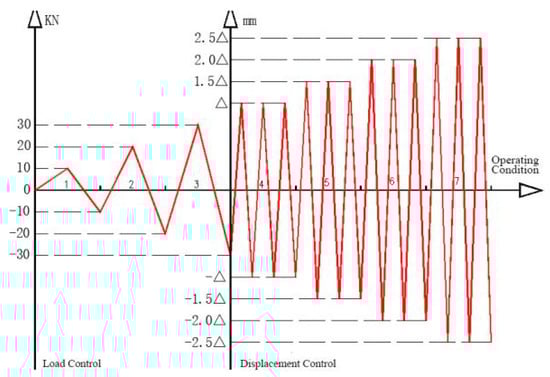 In Equation (1), +Pij and −Pij represent the peak loads of the positive and reverse loading for the jth cycle under the ith condition, respectively; +△ij and −△ij represent the displacement values corresponding to the peak loads of the positive and reverse loading for the jth cycle under the ith condition, respectively.