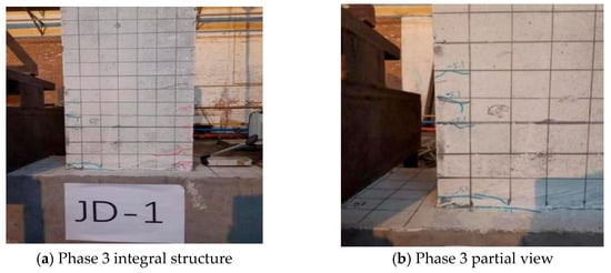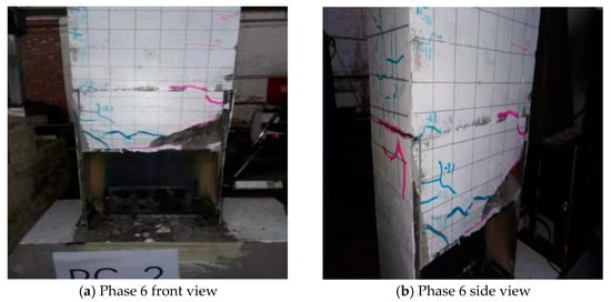 Phase 6: Final failure featured (i) corner concrete disintegration (≈40% cross-section), (ii) asymmetric capacity degradation (positive-direction strength dropped 65% while negative-direction maintained), and (iii) complete crack linkage during the −7.1 cycle causing uncontrolled spalling (Figure 11). Testing terminated due to structural collapse.