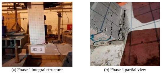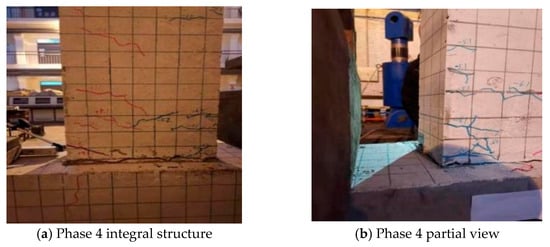 Phase 4: At ±5.2 cycles, (i) interfacial cracks initiated at steel–concrete composite zones, propagating toward midspan; (ii) localized spalling (area ≈ 15 cm2) occurred at the beam front; (iii) left/right cracks remained non-intersecting (Figure 10).