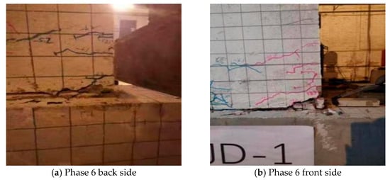 Phase 6: Column lateral faces developed longitudinal cracks. During the −8.1 cycle, beam-end spalling exposed reinforcement, with complete perimeter cracking through beam cross-sections (Figure 9).