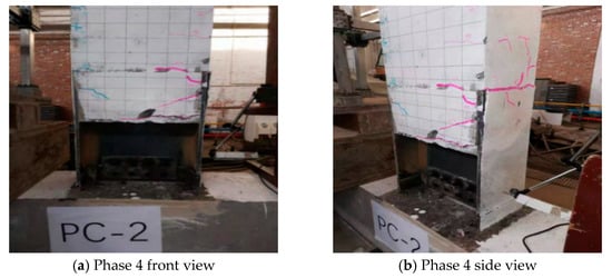 Phase 4: Lateral-face cracks interconnected with front-face cracks, forming through-thickness fractures at the beam root. Column ends developed sparse but wide cracks (>0.5 mm). At the +6.2 loading cycle, concrete bulging occurred in compression zones with localized crushing at the beam’s upper corners (Figure 7).