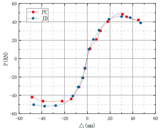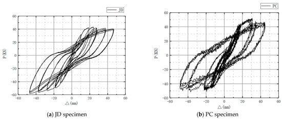 During the first three stages of the test, the JD and PC specimens had not yet yielded and were in the elastic deformation stage. At this time, the displacement was small, the load value increased steadily, the relationship between load and displacement was approximately linear, the performance remained relatively stable, there was almost no residual deformation after unloading, and the energy dissipation capability had not yet been demonstrated. As the test progressed, the load increased incrementally, and the displacement at the beam end increased. The hysteresis curve became flatter and plumper, and its area gradually increased. The deformation rate accelerated. There was a small amount of residual deformation during unloading, and the actuator resisted loading due to the residual deformation. This indicated that the component began to enter the elastoplastic stage. In the middle and later stages of the test, the hysteresis curve rose slowly, with more lateral growth. At the load peak of each stage, the load increased slowly or even stagnated, but the displacement continued to increase. This indicated that the stiffness of the component began to degrade. After the specimen yielded, the loading system was changed to displacement control, and each stage was cycled three times. The maximum load-bearing capacity of the component decreased with the number of loading cycles, indicating that the strength of the component was gradually degrading. Moreover, as the test progressed, the cumulative damage to the components led to a decrease in the energy dissipation capacity of the nodes. The area enclosed by the hysteresis curve decreased progressively with each of the three loading cycles at the same stage.