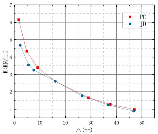 - The equivalent stiffness of both PC and JD specimens was the highest at the initial stage of loading. However, the initial stiffness of the PC specimen was greater than that of the JD specimen. As the test progressed, the stiffness of the specimens gradually decreased. The rate of decrease was significant before yielding but decreased sharply after yielding and gradually became stable.