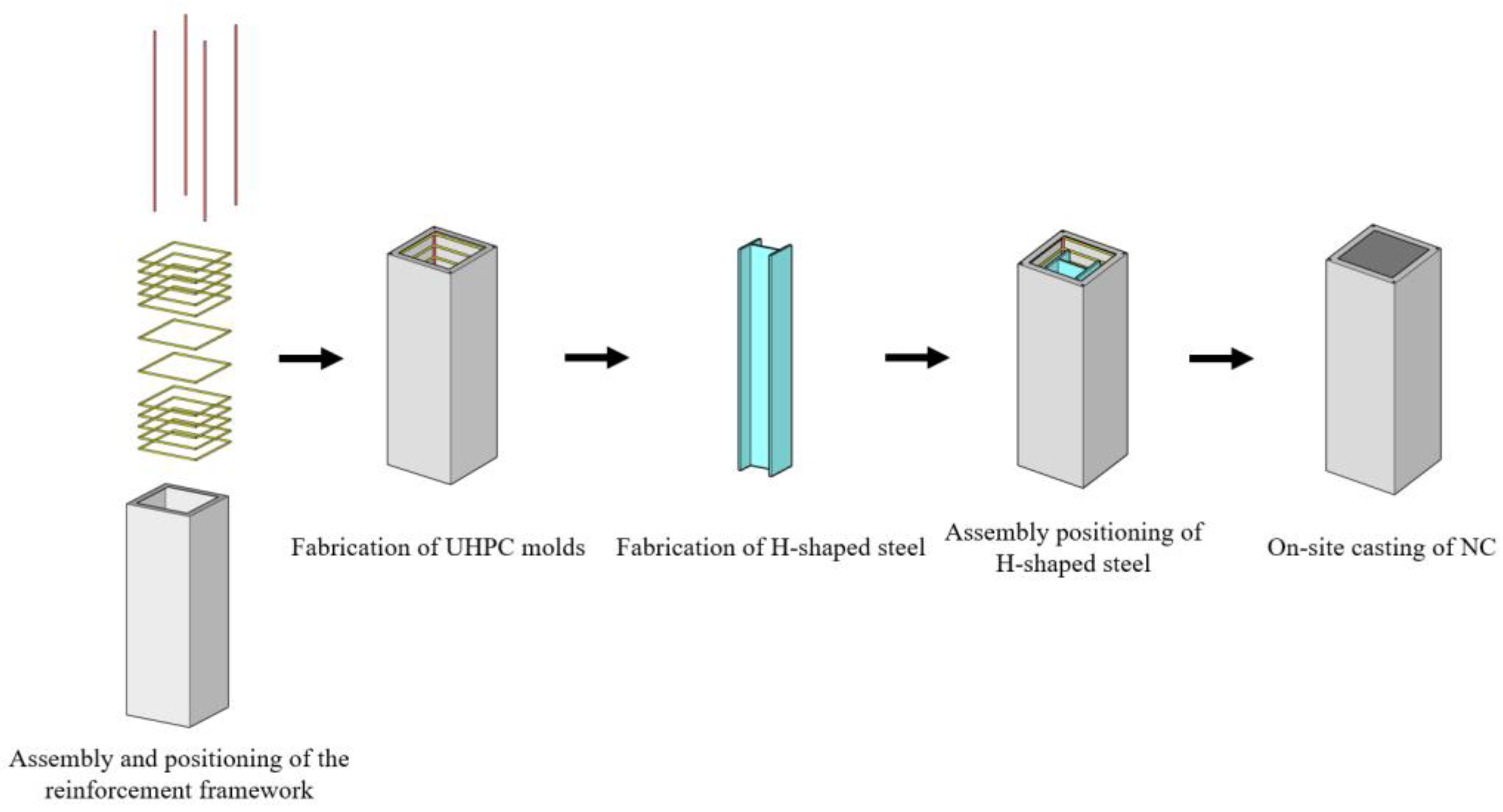 On this basis, this paper proposes a novel UHPC-SRC short-column structure. The structure consists of a UHPC permanent formwork, longitudinal reinforcement, stirrups, and H-shaped steel, forming a composite compression member. The UHPC permanent formwork does not need to be removed after construction, thereby eliminating the processes of formwork installation and dismantling, as well as effectively shortening the construction period; meanwhile, a controllable quality can be ensured during its factory prefabrication process. This innovative structure not only retains the advantage of rapid construction typical of prefabricated structures but also preserves the excellent mechanical performance of traditional cast-in-place structures. The specific configuration of the structure is shown in Figure 1, and its fabrication process is illustrated in Figure 2.