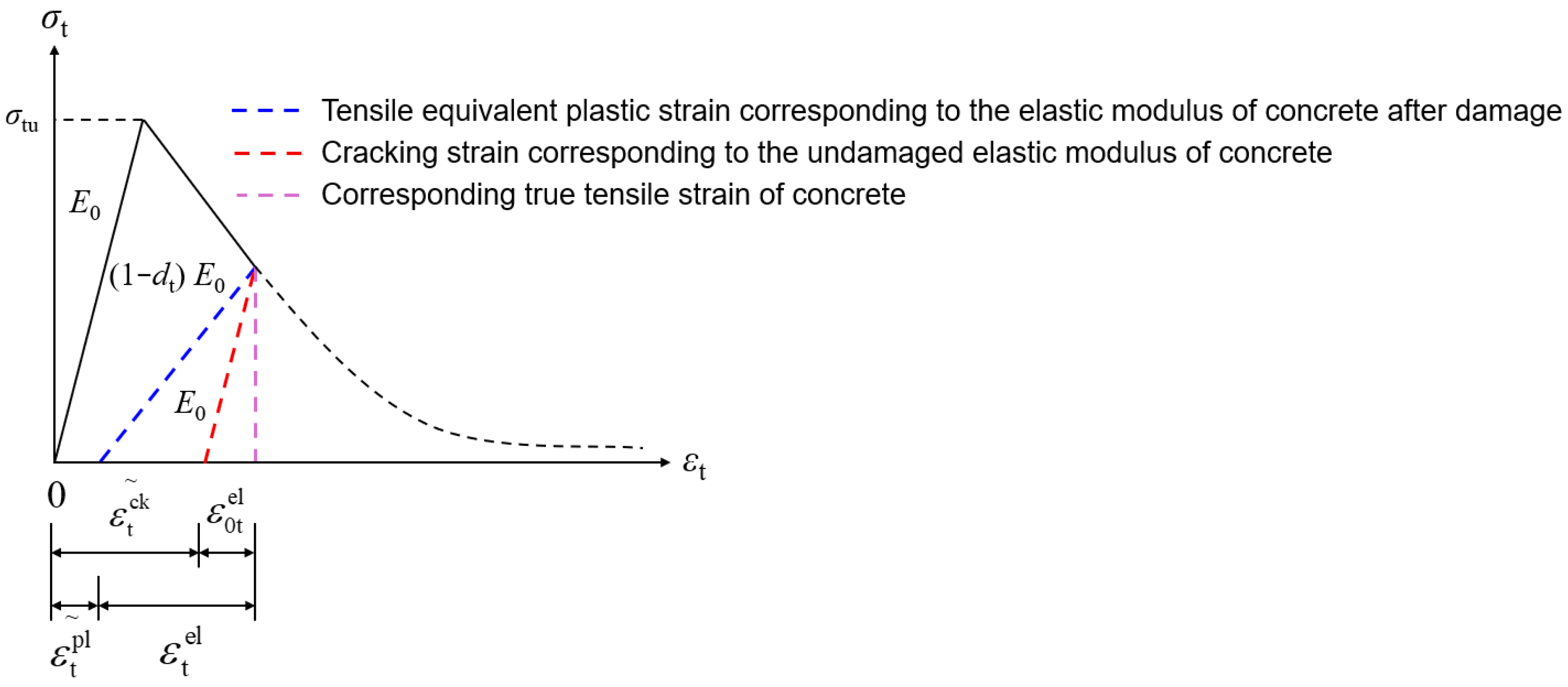 The CDP model, by introducing damage variables in combination with plasticity theory, can effectively characterize the entire transition process of concrete from the elastic stage to the plastic stage under both tensile and compressive states. When concrete is subjected to uniaxial tension or uniaxial compression, the inelastic deformation beyond the elastic range is regarded as damage, and the evolution of damage is represented and controlled by equivalent plastic strain. In the tensile case, a tensile damage factor dt is defined, and its mechanical response can be divided into the elastic stage and the stiffness degradation stage, as shown in Figure 5. In the compressive case, a compressive damage factor dc is defined, and its deformation process consists of an elastic stage, a stress hardening stage, and a softening stage, as shown in Figure 6.