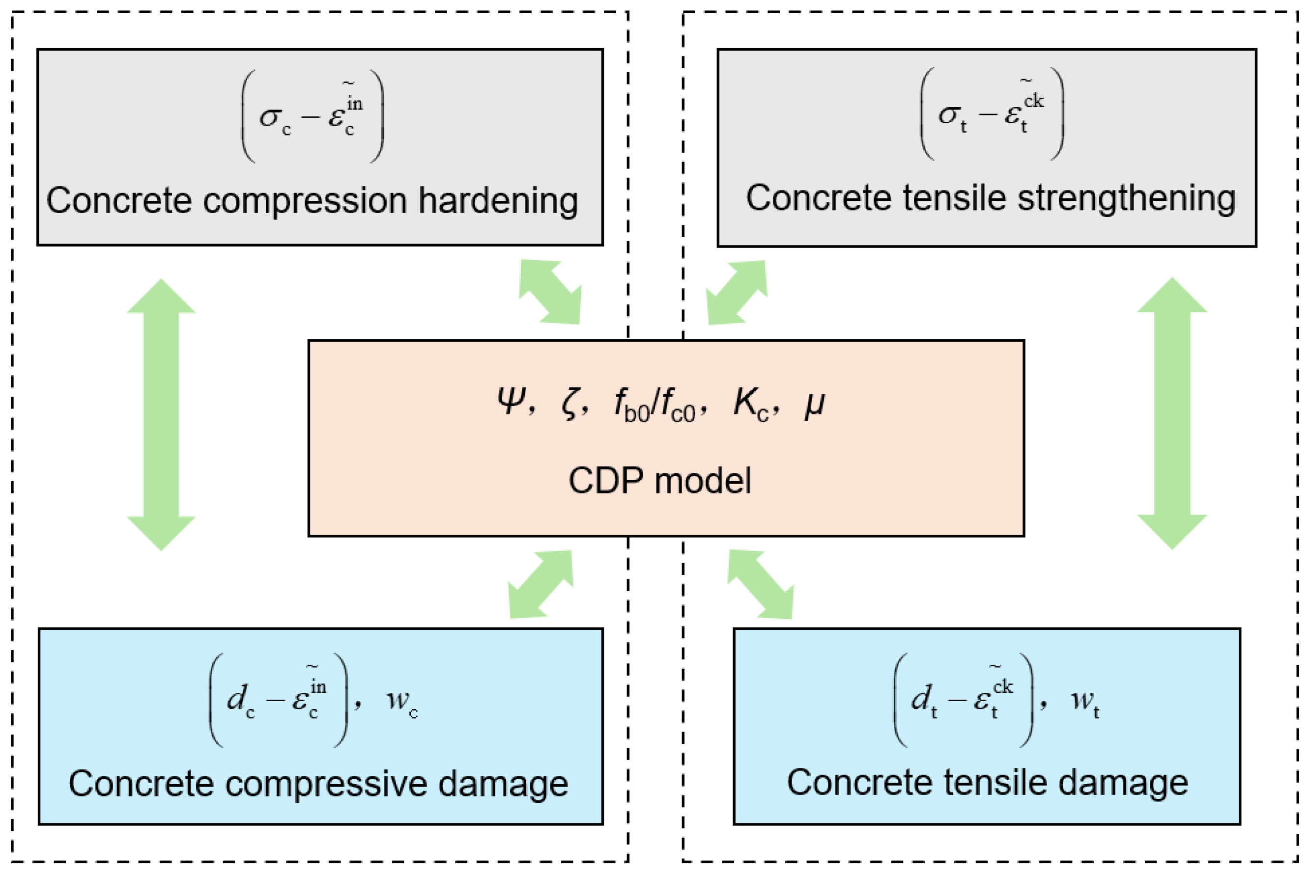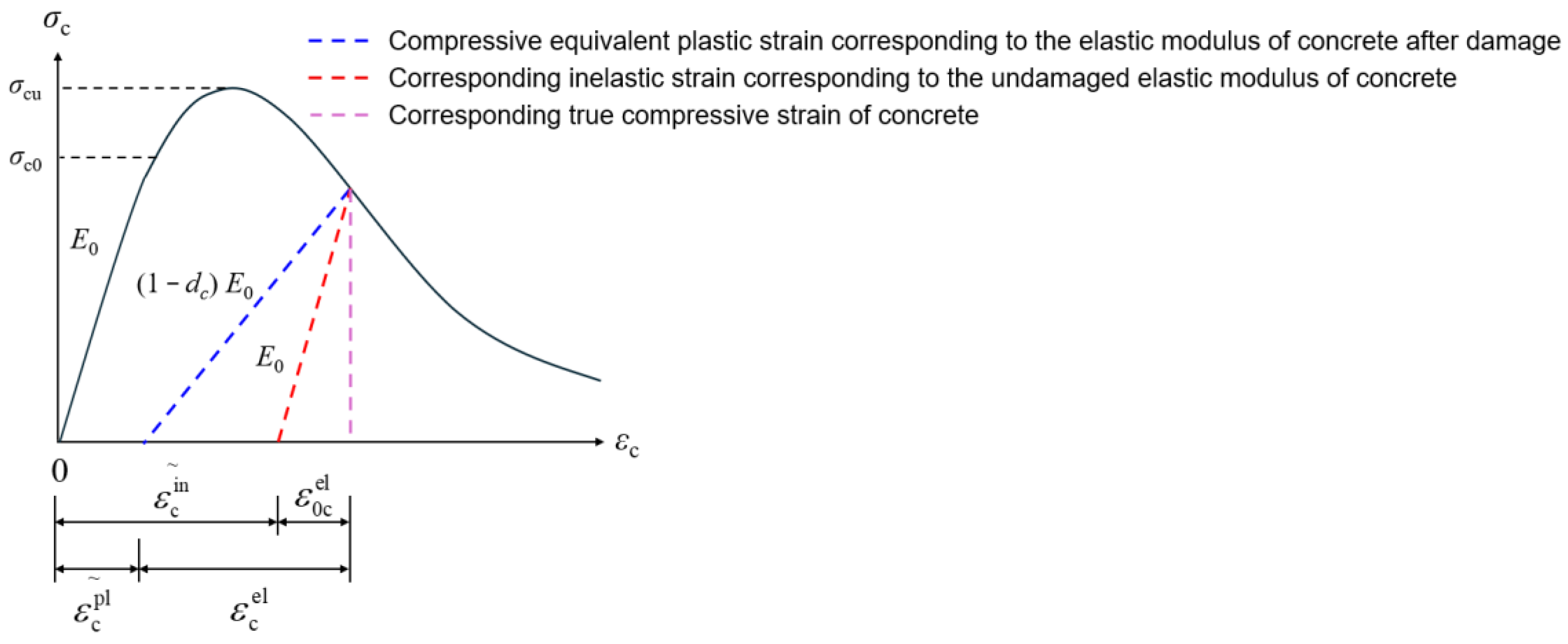 This model integrates elasticity, plasticity, and damage mechanisms in an organic manner, enabling a relatively accurate simulation of the response characteristics of concrete under loading. In terms of parameter settings, the elastic modulus E and Poisson’s ratio ν govern the deformation characteristics in the elastic stage; plasticity parameters such as dilation angle and eccentricity influence the yielding behavior; the initial yield stress ratio and invariant stress ratio determine the exact location of the yield surface; viscous parameters help improve numerical convergence during the softening stage and stiffness degradation process. Through the appropriate selection of these parameters, the CDP model can realistically reproduce the nonlinear behavior and damage evolution of concrete under loading. Parameter definitions are shown in Figure 8.