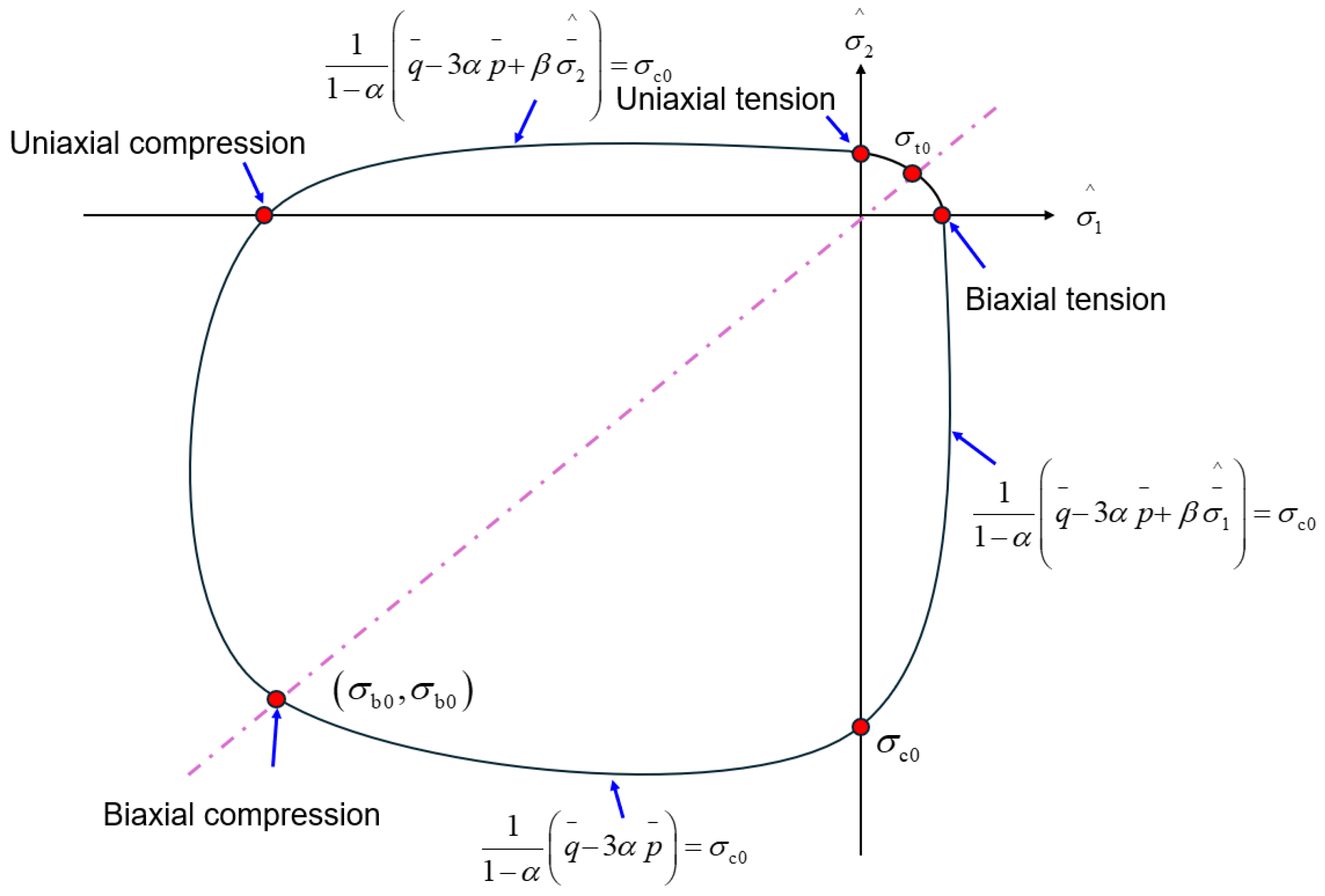 The theoretical framework of the CDP model is based on three core assumptions: the initial yield criterion, the hardening law, and the flow rule. The initial yield criterion is used to reduce a complex multiaxial stress state to an equivalent stress, which is then compared with the material’s yield strength to determine whether plastic deformation occurs. When the equivalent stress exceeds the yield strength, the material enters the plastic stage. The hardening law describes the evolution of the yield surface during plastic deformation. For example, under the Mises criterion, the yield surface expands isotropically, and the yield stresses in compression and tension are approximately equal. The flow rule defines the direction of the plastic strain increment after yielding, and its form depends on the yield surface and the hardening law. Once the first two are specified, the flow rule is consequently determined. The yield surface of the model is shown in Figure 7.