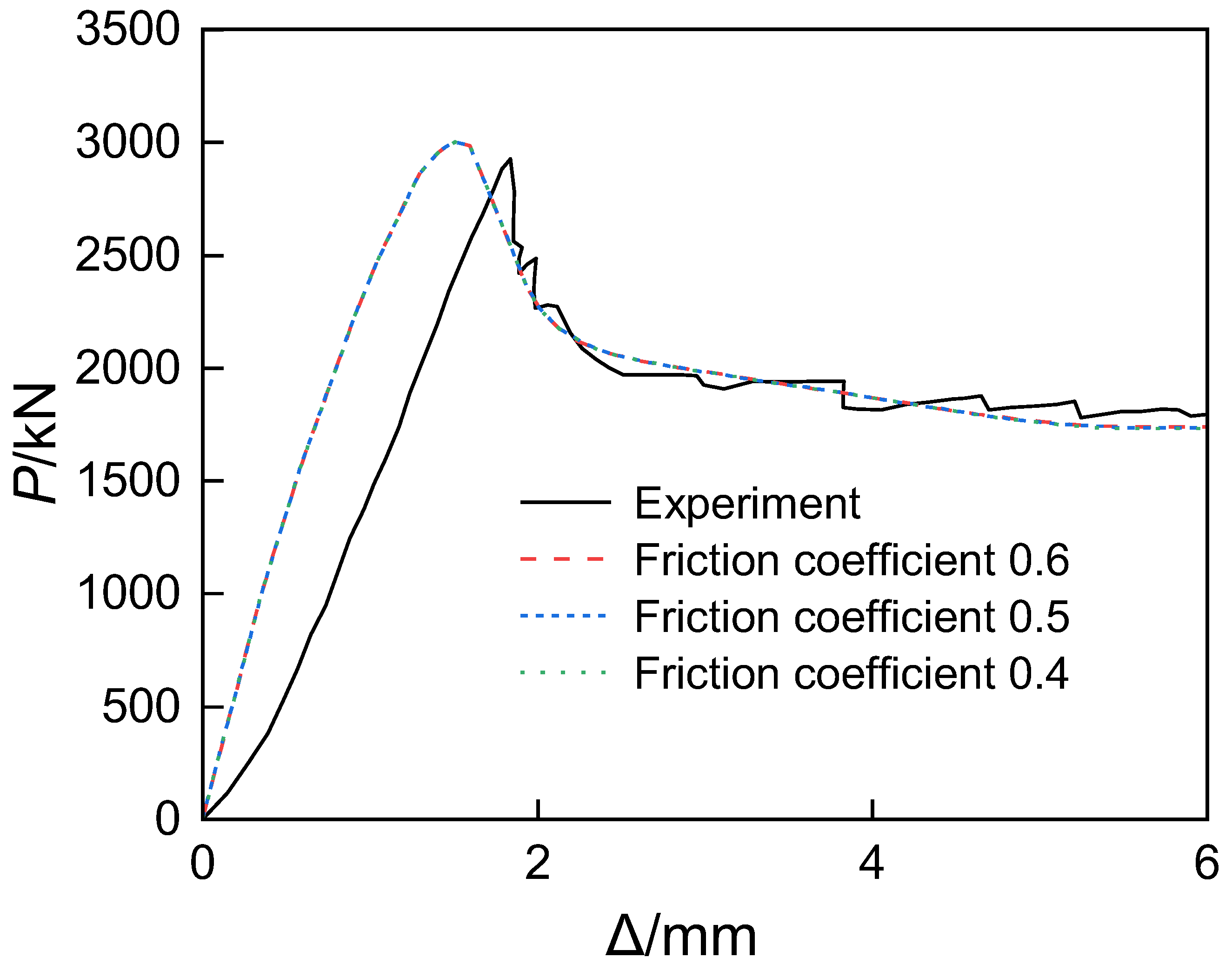 In handling the material interfaces, the interaction between the reinforcement and the surrounding concrete was defined using the Embedded Region option in ABAQUS. For the interfaces between the UHPC panel and the cast-in-place layer, as well as between the cast-in-place layer and the H-shaped steel, hard contact was adopted in the normal direction, while the Coulomb friction criterion was applied in the tangential direction, typically with a friction coefficient of 0.6 [29]. A sensitivity analysis was conducted for friction coefficients of 0.4, 0.5, and 0.6, by comparing the axial load–displacement curves of short columns, evaluating computational efficiency, and calculating the ratio of ultimate loads obtained from experiments and simulations, in order to determine the optimal friction coefficient.