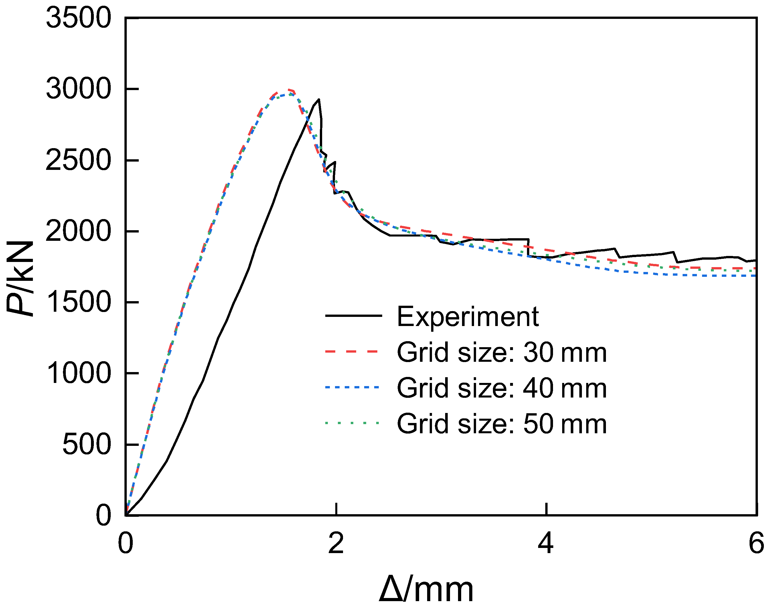 The rigid cushion blocks were connected to the surface of the short columns using a bonded contact method. To assess the influence of mesh discretization on the computational results, a sensitivity analysis was conducted by comparing three mesh sizes: 30 mm, 40 mm, and 50 mm. The results indicate that when both the concrete and structural steel adopt a mesh size of 30 mm, a desirable balance between accuracy and computational efficiency can be achieved.