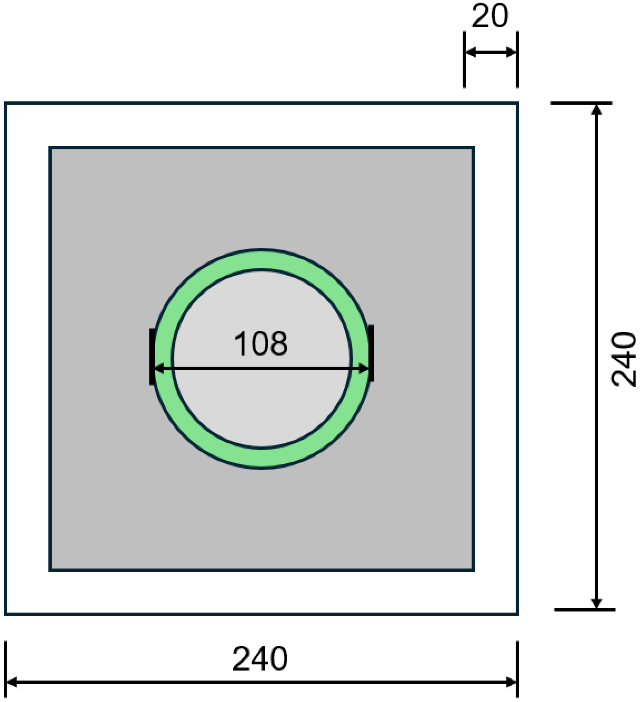 The literature [32] has conducted experimental studies on UHPC formwork–concrete-filled steel tube composite columns. In this study, specimen U-CFST-20-1-A was selected as the subject for finite element analysis. Figure 12 presents the three-dimensional schematic diagram of specimen U-CFST-20-1-A. Figure 13 shows the mesh division of the specimen. Figure 14 provides the specific cross-sectional dimensions of the specimen. The specimen has a height of 720 mm, a cross-sectional width of 240 mm, a UHPC formwork thickness of 20 mm, and a steel tube thickness of 4 mm. A rigid pad is placed at both the top and bottom ends of the specimen. The thickness of each pad is 50 mm, and the cross-sectional width is 240 mm.