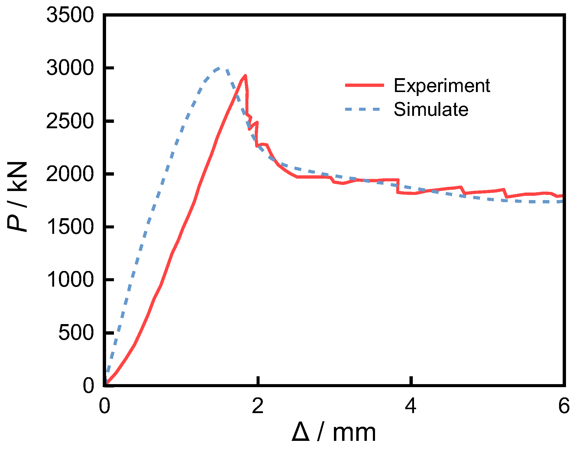 The results of finite element simulations were compared with experimental data, with a focus on the analysis of the axial load–displacement (P-Δ) curves. Figure 15 presents a comparison of the two. The initial stiffness obtained from the numerical simulation is generally slightly higher than the experimental result, but in the descending stage of the curve, the two agree well. The ultimate load measured in the test, Put, is 2939 kN, while the ultimate load obtained from the finite element simulation, PuFE, is 3001.77 kN. The ratio of the ultimate bearing capacities between the two is 0.98, indicating good agreement. Based on these ratios, it can be concluded that the numerical simulation results are highly consistent with the experimental results, demonstrating that the established finite element model has good reliability.