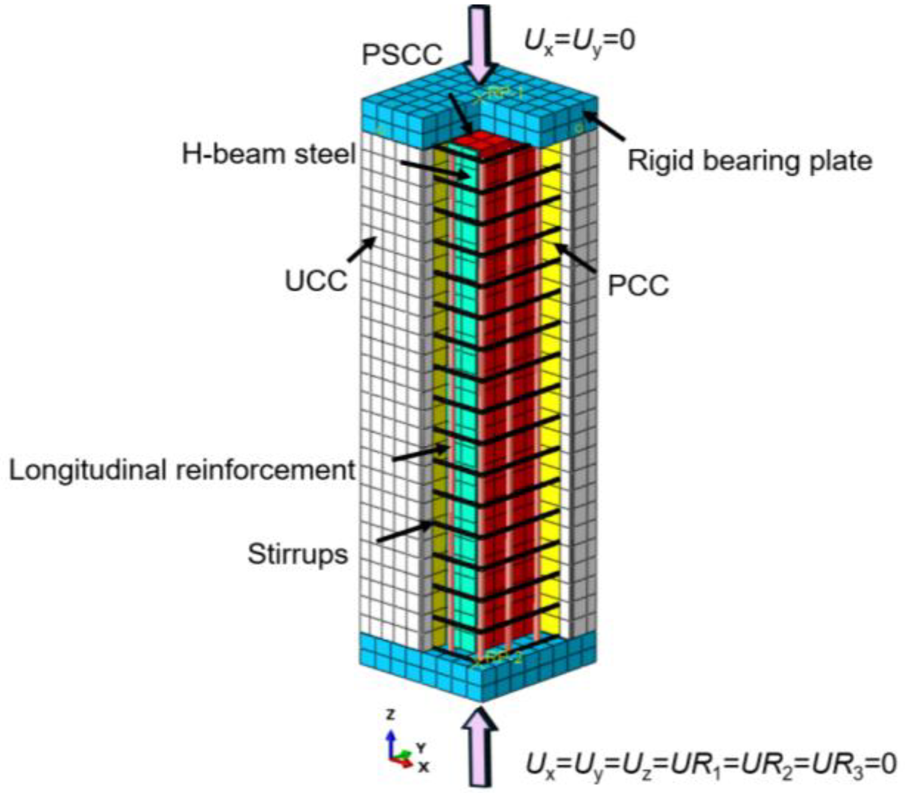 In this study, the UHPC and steel sections were modeled using C3D8R elements, while the longitudinal reinforcement and stirrups were simulated with two-node three-dimensional truss elements (T3D2). For the treatment of material interfaces, hard contact was applied in the normal direction between UHPC and the steel section, and the Coulomb friction criterion was employed in the tangential direction with a friction coefficient of 0.6. The mesh sizes for both UHPC and the steel section were set to 30 mm to balance computational efficiency and accuracy. The rigid bearing blocks were connected to the surfaces of the short columns via tie constraints. The rigid base plate at the bottom of the column was fully fixed (Ux = Uy = Uz = UR1 = UR2 = UR3 = 0), while the upper rigid bearing plate was designed as a sliding hinge support (Ux = Uy = 0), with a downward displacement of 10 mm applied at the reference point of the bearing plate.