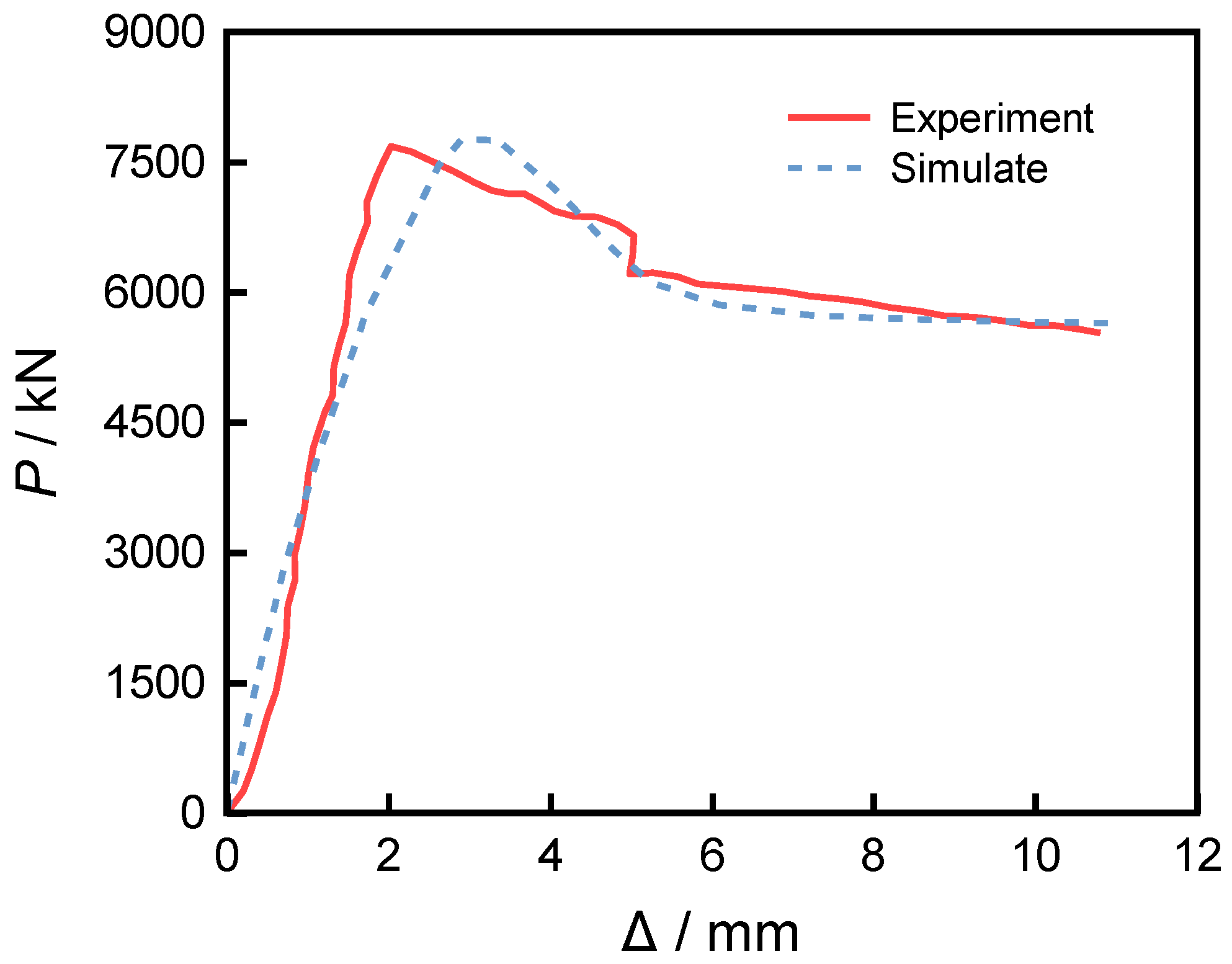 The finite element simulation results were compared with the experimental data, with a focus on analyzing the behavior of the axial load–displacement (P-Δ) curves. Figure 19 presents the comparison results between the two. As shown in the figure, the trend of the numerically simulated curve is generally consistent with that of the experimental results, both exhibiting a slanted linear form before reaching the peak value. The ultimate load measured in the experiment, Put, was 7736 kN, while the ultimate load obtained from the finite element simulation, PuFE, was 7767.04 kN, resulting in a ratio of ultimate bearing capacities of 0.99. This indicates a high level of agreement between the two sets of results, demonstrating that the established finite element model possesses good reliability.