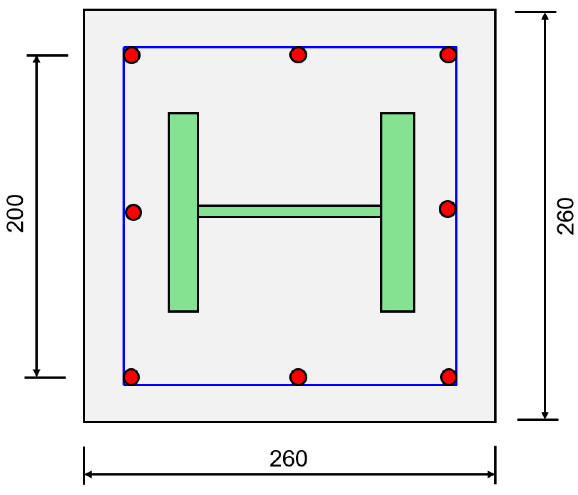 The literature [35] reports experimental studies on UHPC-encased S690 high-strength steel short columns. In this study, the specimen S690-C130-SP60-H was selected as the subject for finite element analysis. Figure 20 presents a three-dimensional structural schematic of the specimen, Figure 21 displays its mesh division, and Figure 22 provides detailed cross-sectional dimensions. According to the degree of confinement imposed by stirrups and structural steel on the concrete, the confined concrete can be categorized into three types: partially steel-confined concrete (PSCC), partially confined concrete (PCC), and unconfined concrete (UCC) [34]. The specimen has a height of 600 mm and a cross-sectional width of 260 mm. Rigid bearing plates with a thickness of 50 mm and a cross-sectional width of 260 mm are placed at both the top and bottom ends of the specimen.