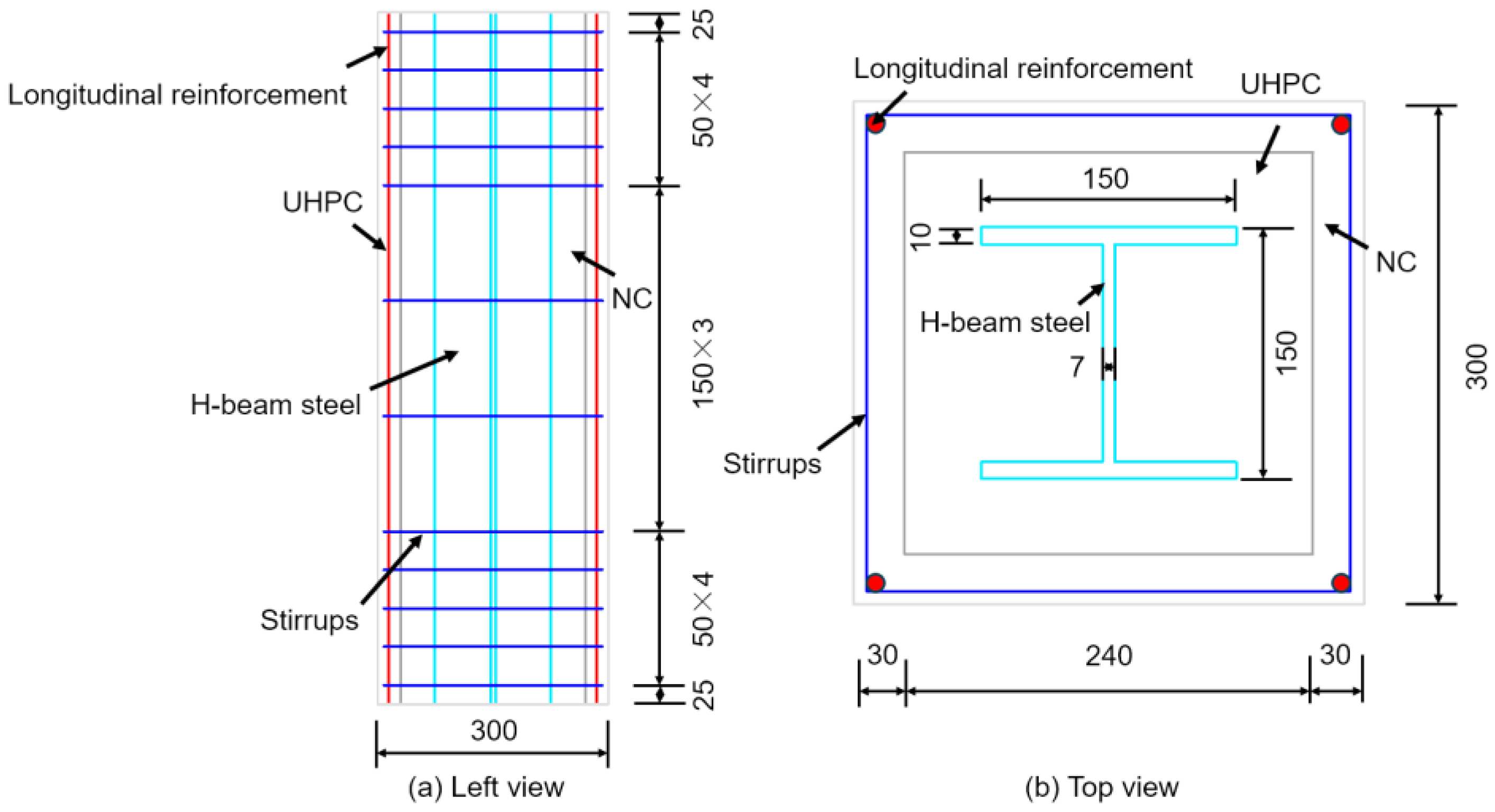 The cross-sectional width of the short column is 300 mm, and the height is 900 mm. The thickness of the UHPC formwork is 30 mm, while the cast-in-place NC layer has a cross-sectional width of 240 mm. At both the top and bottom ends of the specimen, a rigid bearing plate is installed, each with a thickness of 50 mm and a cross-sectional width of 300 mm. The strength grade of the cast-in-place concrete is C30. The built-in H-shaped steel is made of Q235 grade, with sectional dimensions of 150 × 150 × 7 × 10 mm. Four longitudinal reinforcing bars of HRB400 grade, each with a diameter of 8 mm, are arranged inside the UHPC formwork. Stirrups are placed on the outermost side of the formwork, with a protective layer thickness of 5 mm. The distance from the outer edge of the topmost and bottommost stirrups to the concrete edge is 25 mm. The stirrups use HRB400 grade steel bars with a diameter of 6 mm, and are spaced at 50 mm and 150 mm.