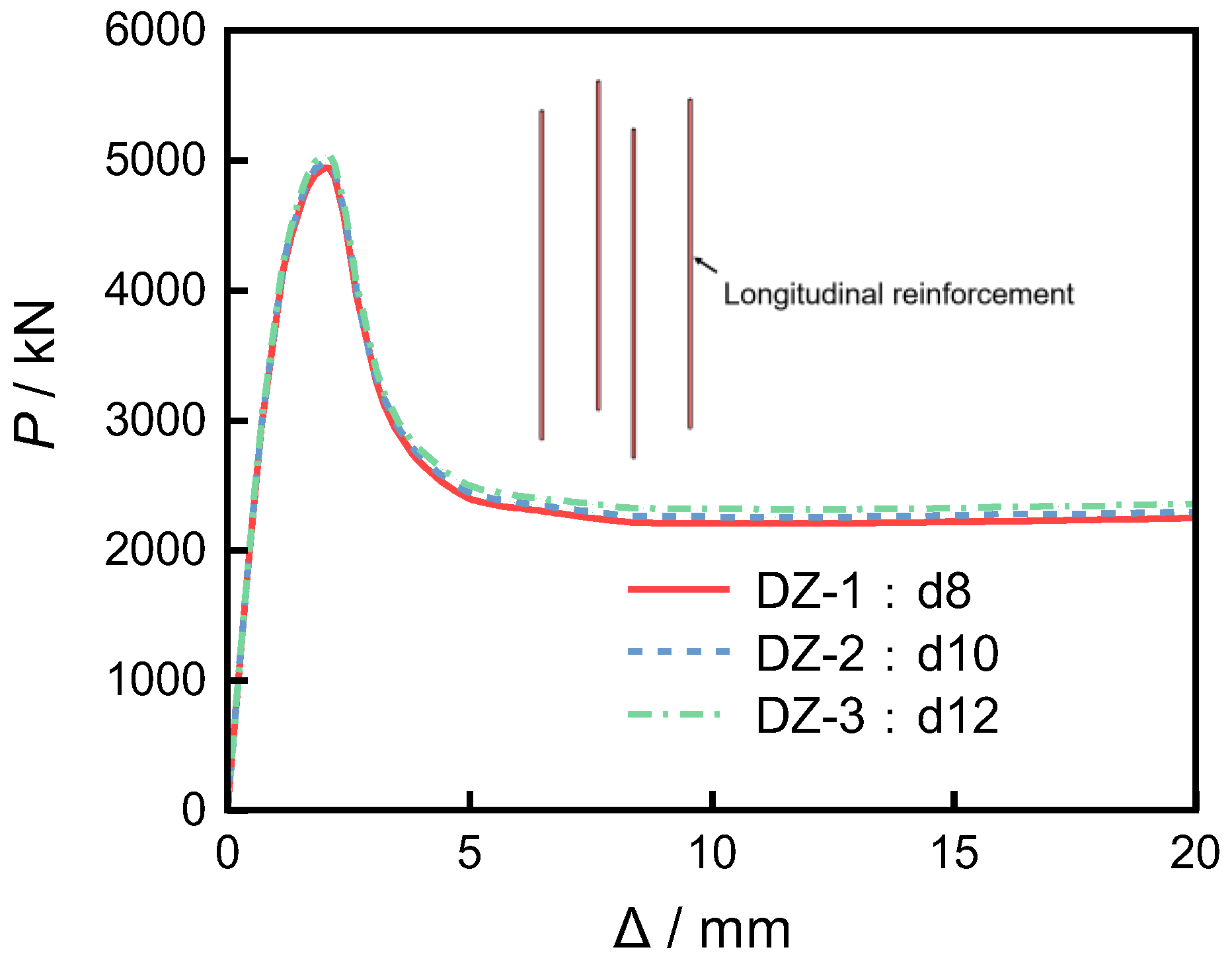 Three groups of specimens, DZ-1, DZ-2, and DZ-3, were used to investigate the influence of longitudinal reinforcement ratio on the axial load–displacement curves. As shown in Figure 25, when the longitudinal reinforcement ratio increased gradually from 0.22% to 0.35% and 0.50%, the ultimate loads increased by 0.91% and 2.02%, respectively, compared to DZ-1, indicating only a slight overall improvement. This suggests that increasing the longitudinal reinforcement ratio has a limited effect on enhancing the performance of UHPC-SRC short columns.