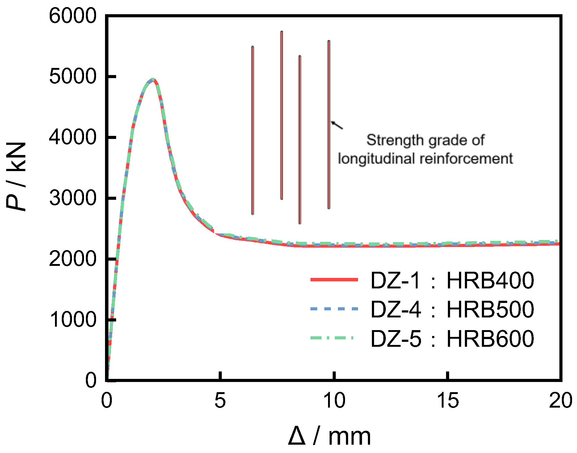 Three groups of specimens, DZ-1, DZ-4, and DZ-5, were used to investigate the influence of longitudinal reinforcement strength on the axial load–displacement curves. As shown in Figure 26, as the longitudinal reinforcement strength increased sequentially from HRB400 to HRB500 and HRB600, the ultimate load increased by 0.33% and 0.47% compared to DZ-1, respectively. The overall increase is even less than the increase in the longitudinal reinforcement ratio. This indicates that improving the longitudinal reinforcement strength, similar to increasing the longitudinal reinforcement ratio, has a limited effect on the performance enhancement of UHPC-SRC short columns.