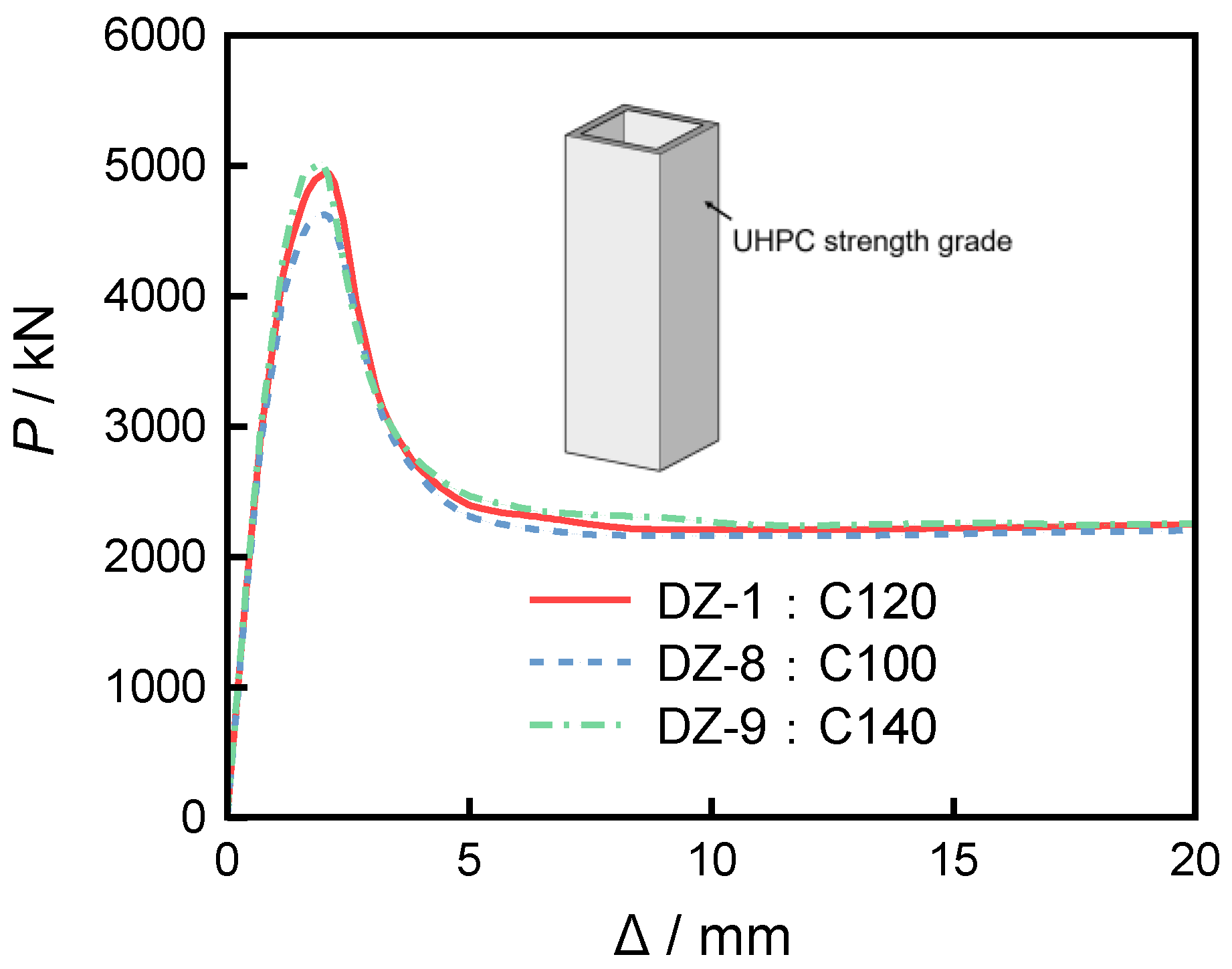 Three groups of specimens, DZ-1, DZ-8, and DZ-9, were used to investigate the influence of the strength grade of the permanent formwork on the axial load–displacement curve. As shown in Figure 28, with an increase in the formwork strength grade from C100 to C120 and C140, the ultimate load increases by 12.92% and 16.71%, respectively, compared to DZ-8. Enhancing the UHPC strength grade can effectively improve the load-bearing capacity of UHPC-SRC short columns, although its effect is slightly less significant than increasing the thickness of the permanent formwork. Additionally, increasing the UHPC strength grade results in a reduction in the ultimate displacement.