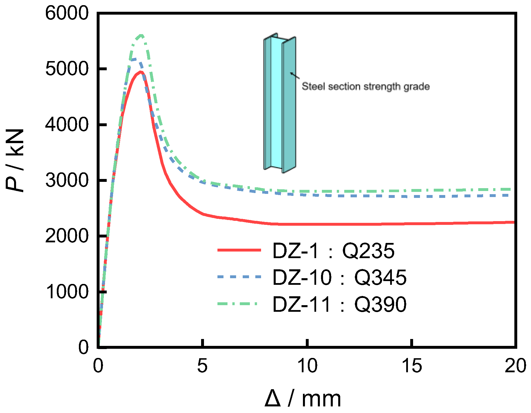 Three groups of specimens, DZ-1, DZ-10, and DZ-11, were used to investigate the effect of the strength grade of structural steel on the axial load–displacement curve. As shown in Figure 29, as the strength grade of structural steel increases from Q235 to Q345 and Q390, their ultimate loads increase by 6.57% and 8.13%, respectively, compared to DZ-1. Although increasing the strength grade of structural steel can enhance the performance of UHPC-SRC short columns, the degree of improvement is slightly less than that achieved by changing the thickness and strength grade of the permanent formwork.