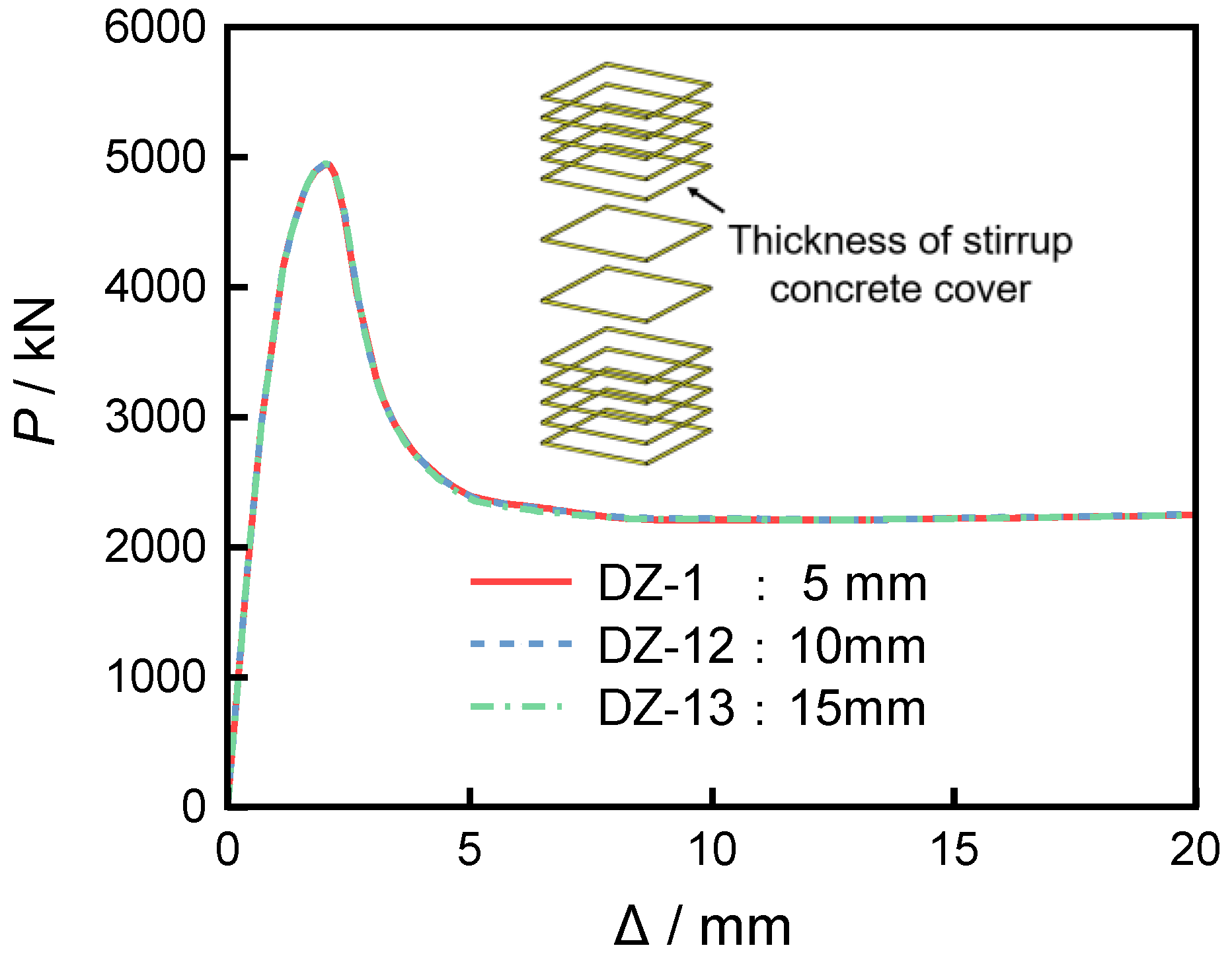 Three groups of specimens, DZ-1, DZ-12, and DZ-13, were used to investigate the effect of stirrup protective layer thickness on the axial load–displacement curve. As shown in Figure 30, when the stirrup protective layer thickness increases from 5 mm to 10 mm and 15 mm, the ultimate load decreases by 5.44% and 5.26%, respectively, compared with DZ-1. This indicates that the closer the stirrups are to the edge of the UHPC formwork, the more significant the confinement effect, resulting in a stronger restraining action.