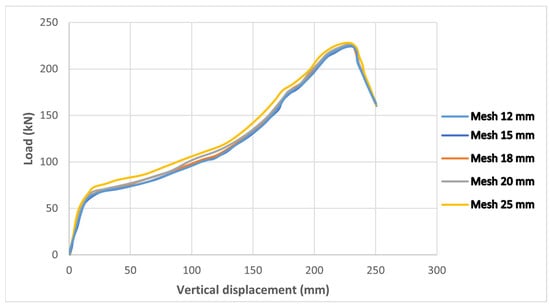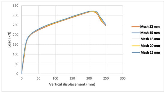 A mesh sensitivity study was carried out on validation models using element sizes of 25, 20, 18, 15, and 12 mm (Figure 1 and Figure 2). Figure 1 presents the mesh sensitivity analysis conducted for the experimental test carried out by Chen et al. [], while Figure 2 illustrates the corresponding mesh sensitivity analysis for the experimental program reported by Alrubaidi et al. []. The results confirmed that the global response converged, with only minor variations once the mesh reached 15 mm. Accordingly, a 15 mm discretization was adopted for the overall model to maintain an appropriate balance between accuracy and computational cost, which is particularly important for explicit simulations. In the reduced beam section and around the web openings, where stress concentration and fracture are critical, a finer mesh of 8 mm was introduced to ensure accurate representation of local damage and failure mechanisms (Figure 3).
