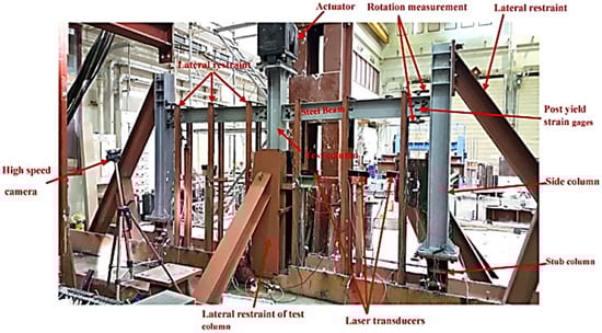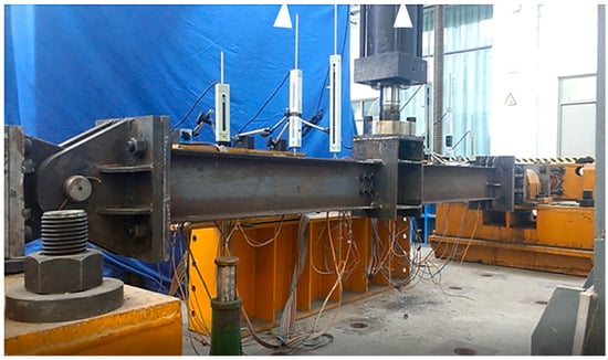 The specimen was made from Q235 steel. Beams were HN 200 × 100 × 5.5 × 8 mm, and columns were HW 250 × 250 × 9 × 14 mm. The reduced beam section geometry (a = 50 mm, b = 130 mm, c = 23 mm) followed FEMA-350 [] seismic guidelines [].