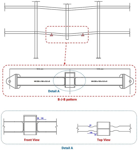 From Chen et al. [], the specimen WUF-W-RBS-50-130-23 was used as a reference. This specimen had welded unreinforced flanges and a fully welded web, which directed plastic hinges into the reduced beam section instead of the brittle weld zone. Figure 8 shows the test setup reported in [], where the beam-to-column assembly was simplified into a beam–joint–beam configuration. The supports acted like hinges at mid-span, representing the inflection points after column removal. Supports were fixed to rigid steel frames anchored to the floor but still allowed free in-plane rotation.