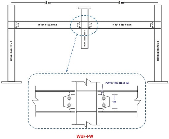 From Alrubaidi et al. [], the WUF-FW specimen was used. This was a one-third scale, single-storey, two-bay frame (Figure 9) []. It included H200 × 200 × 12 × 8 mm columns and H194 × 150 × 9 × 6 mm beams spaced 2000 mm apart. The beam web was connected with a bolted shear tab (120 × 100 × 6 mm, M16 bolts, grade 10.9). The flanges were welded to the column with fillet welds. All members were made from Q235 steel. Supports were designed to allow in-plane rotation. A central actuator applied displacement-controlled loading to simulate column removal.