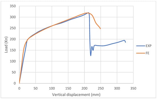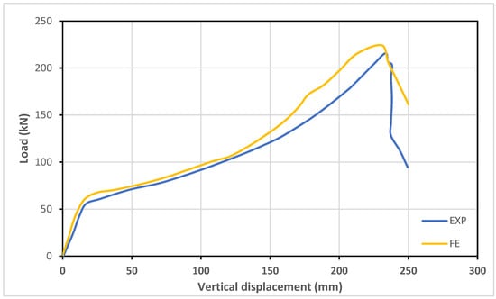 Figure 10 and Figure 11 show the comparison between experimental and FE load–displacement curves, reported in the literature Chen et al. [] and Alrubaidi et al. []. The FE model matched both the stiffness at the start and the nonlinear behavior afterward.