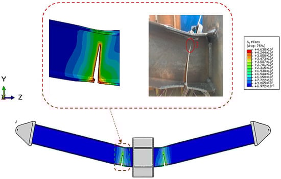 Figure 12 and Figure 13 compare failure patterns with the results from Chen et al. [] and Alrubaidi et al. []. The FE model reproduced the same crack initiation, propagation, and rupture modes as the experiments. This confirms the model captures both global response and local damage.